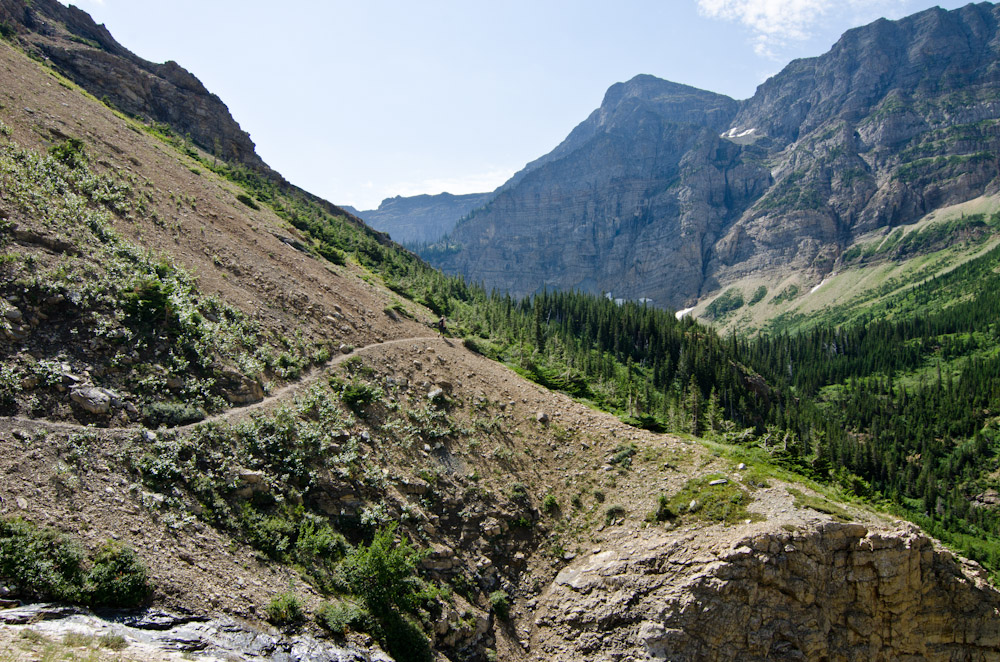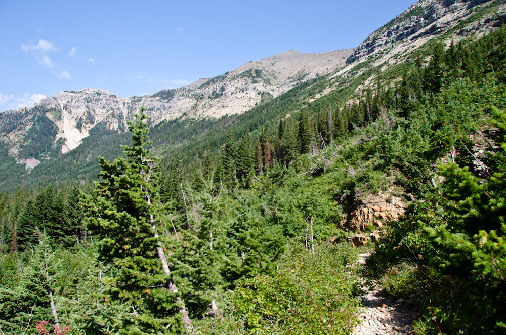 So I started back after a 45 min break. Downhill was generally much easier, as gravity did 80% of the work.(and I don’t have bad knees to bug me) I was still quite tired and stopped a few times, but I made much better time on the way down. I was doing well enough that I took the alternative fork near the bottom that went by Hells Roaring Falls and Canyon. The river ran through a bit of a rock canyon and made a few nice waterfalls along here. What was really neat was that the mountain across from the trail, looked like someone had sliced the corner off, and there were huge cliffs that went straight down, with the water roaring along at the bottom.
