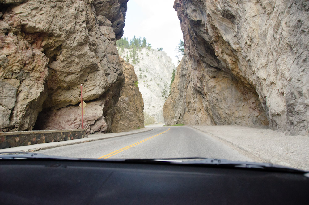 Once I made the turn into Kootenay park, things got really spectacular. There were some spots where the road went through a canyon with straight rock on either side. I went through it several times to get good pictures. And it just kept getting better, the mountains were much bigger than in Waterton, and had large areas that were bare rock with no trees, and the odd bit of snow.