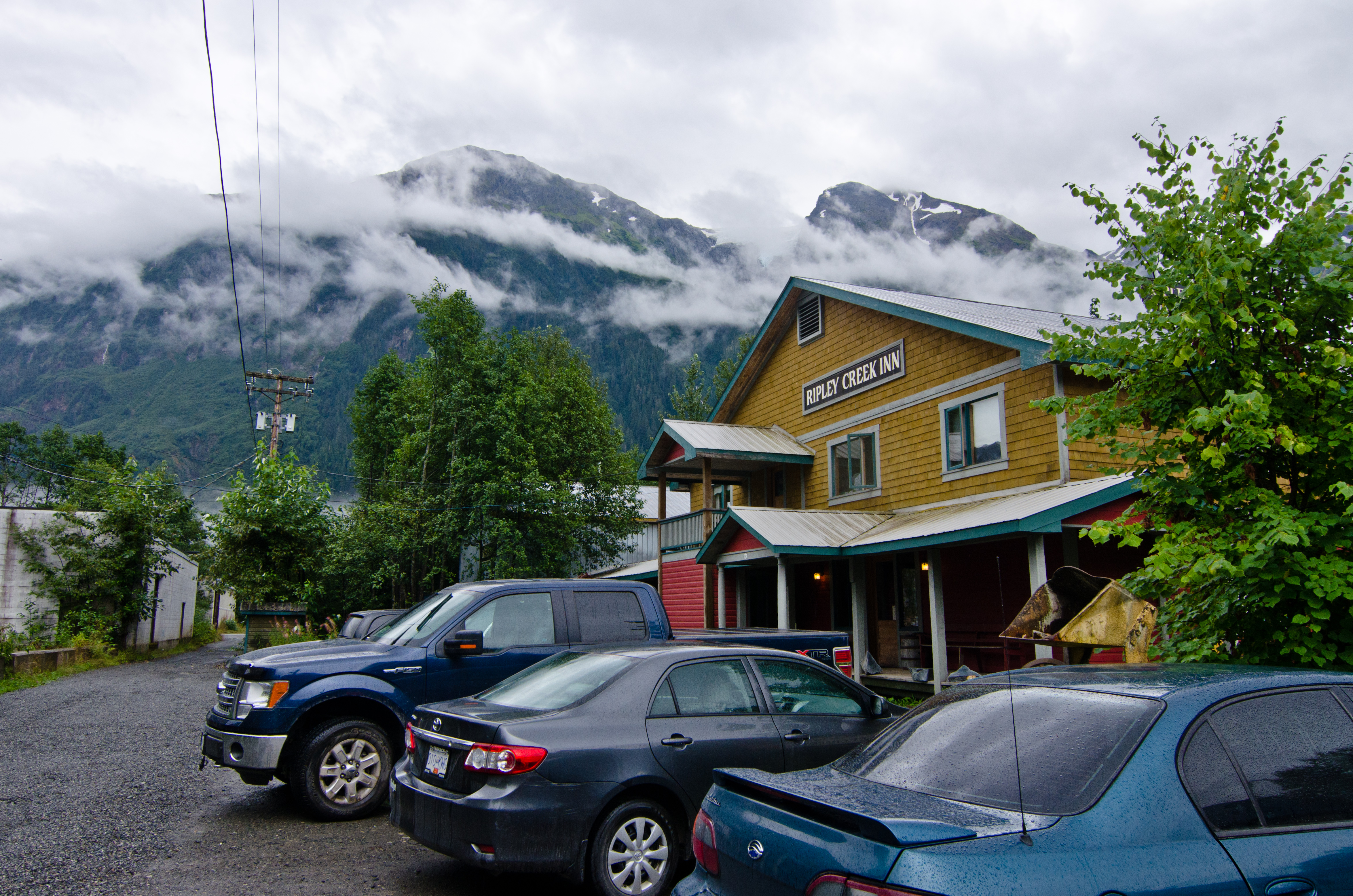 I originally had plans to camp up at the summit, but there was rain on the schedule and I figured it wouldn’t be a good idea to wait until tomorrow when the road would be wet to drive back. So I headed back. Just as I got to the paved side of the road, it started pouring rain. I went through Canada customs with no problem at all, and headed back to Stewart. I was originally going to camp, but decided to try to stay in the Ripley Creek Inn, which looked kind of cool as it was using all renovated 120 year old buildings. So that’s where I am now. I went out for dinner and had Salmon…on the same day that I saw the Salmon glacier.