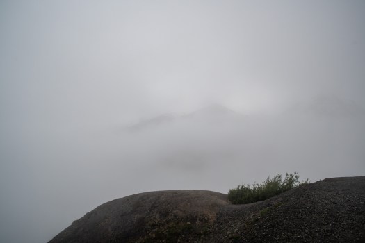 …Back to waking up to the rain. I emerged from the tent and it was so foggy, I couldn’t see the mountains at all. Here I was hoping for a clear day, and it was thicker than ever. I spent a couple hours reading, and then out of nowhere, the sun pierced through the fog! Soon, a small patch of blue sky! The mountains were still covered in fog, but I was excited…I loaded up and set out to drive the road to the glacier!