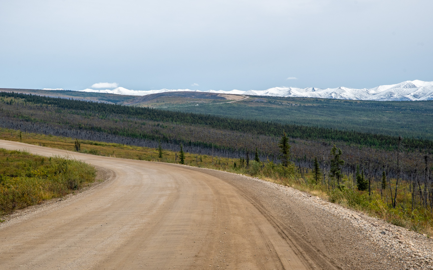 I started the day off still in the plains area beyond the Ogilvie Mountains. At this point there were plenty of trees again. The mountains in the distance were ever moving closer. The road was still quite rough, so it was slow going.