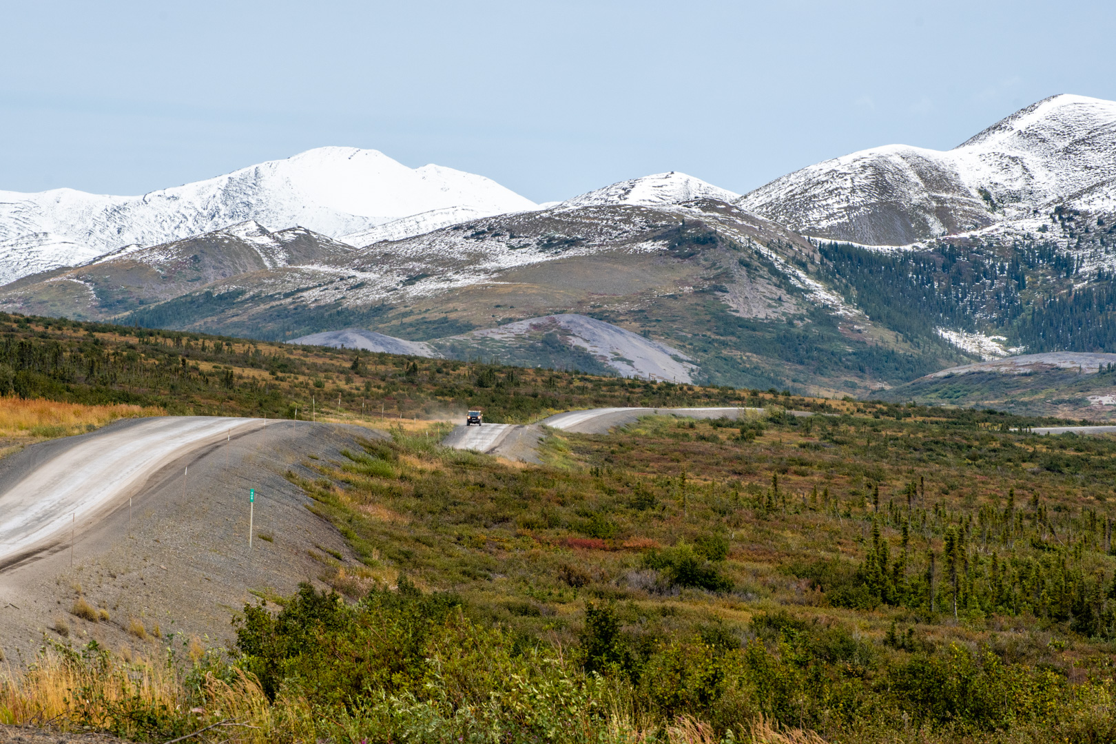 In the distance I could see the road begin to climb up over the mountains. Wright Pass. The views were amazing from up there. There was also remnants of snow on the ground at the pass…as well as evidence that it had been thick enough that they plowed the road. I heard later that the bad weather had actually caused a truck to jackknife and a portion of the road had been closed. This was the same snowy weather than originally had me heading back to Dawson to wait out.