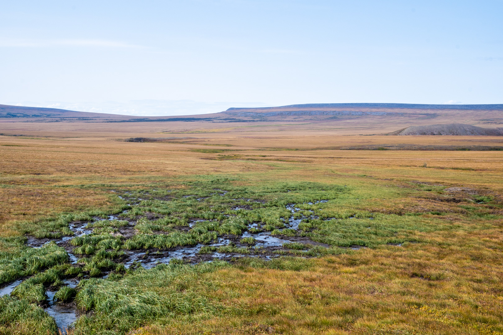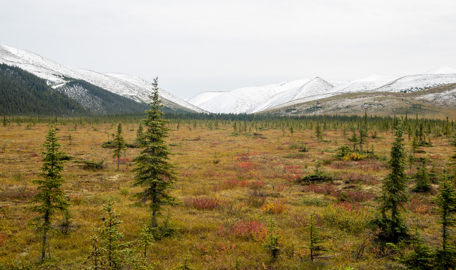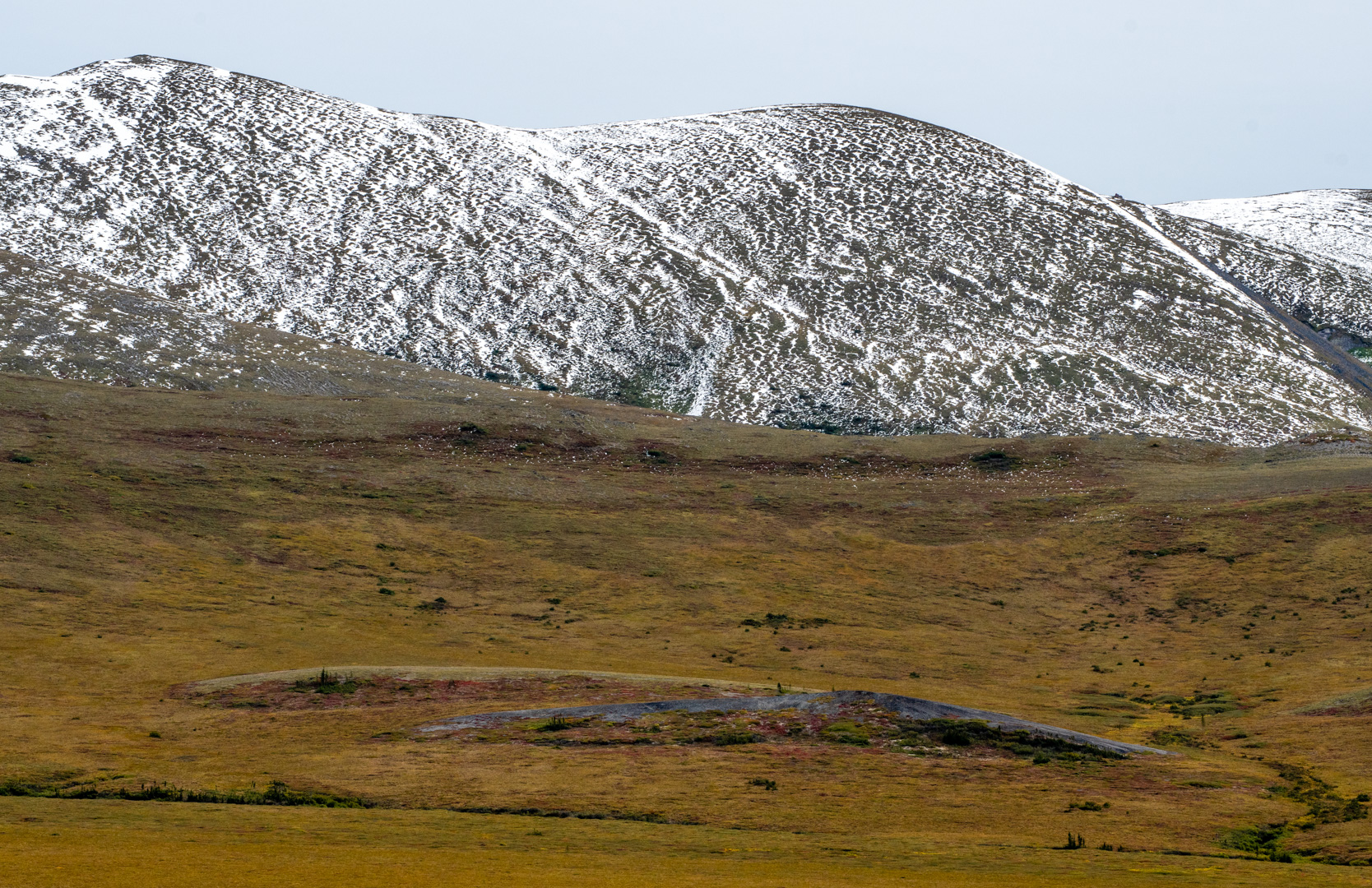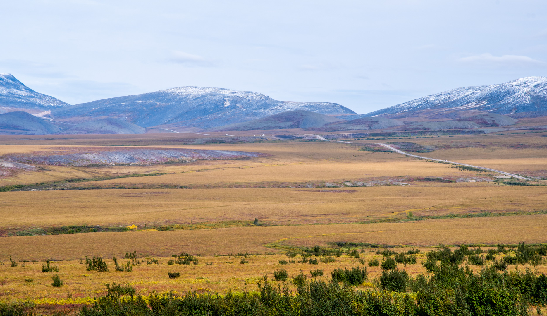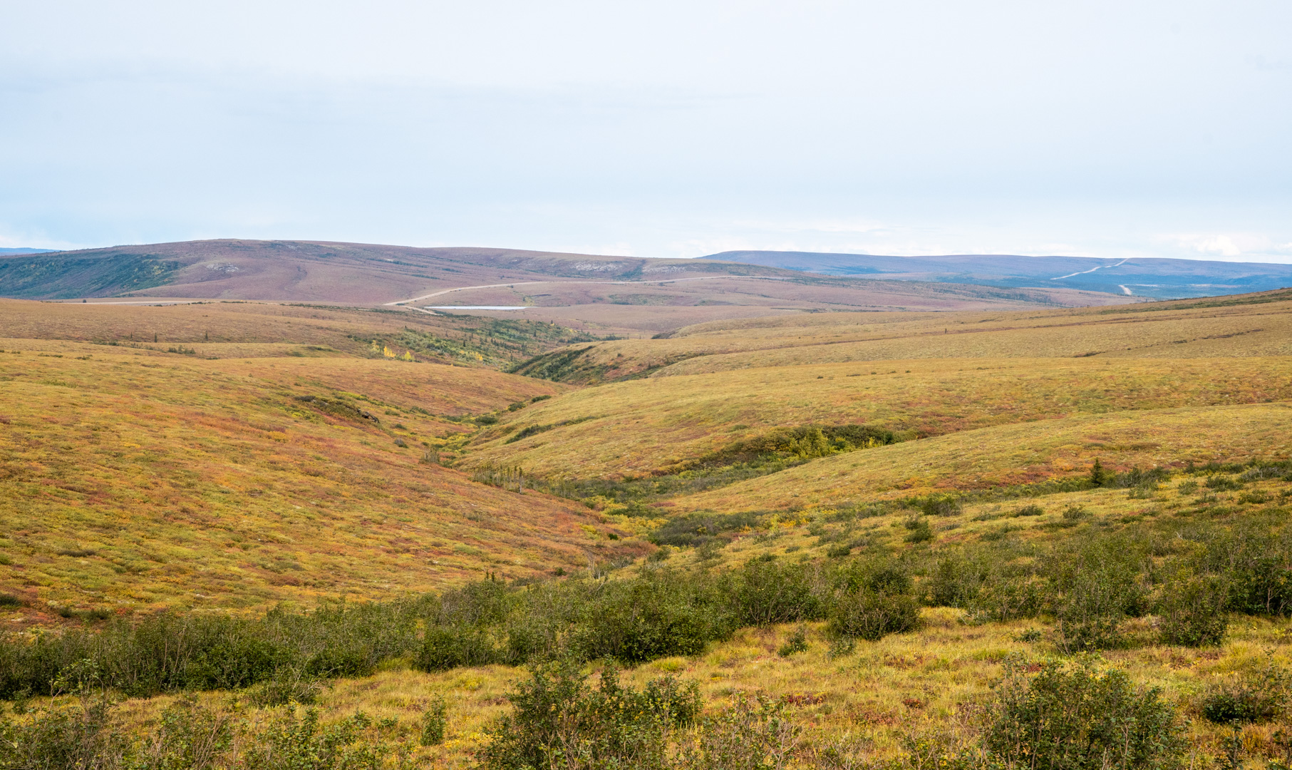 From the circle on, the Dempster followed along the side of the mountains through a vast plain. This was the most breath taking part of the journey. The colours were amazing and the vastness was beyond imagination. The trees still stuck around, but were more random and stunted. I took a ton of pictures…