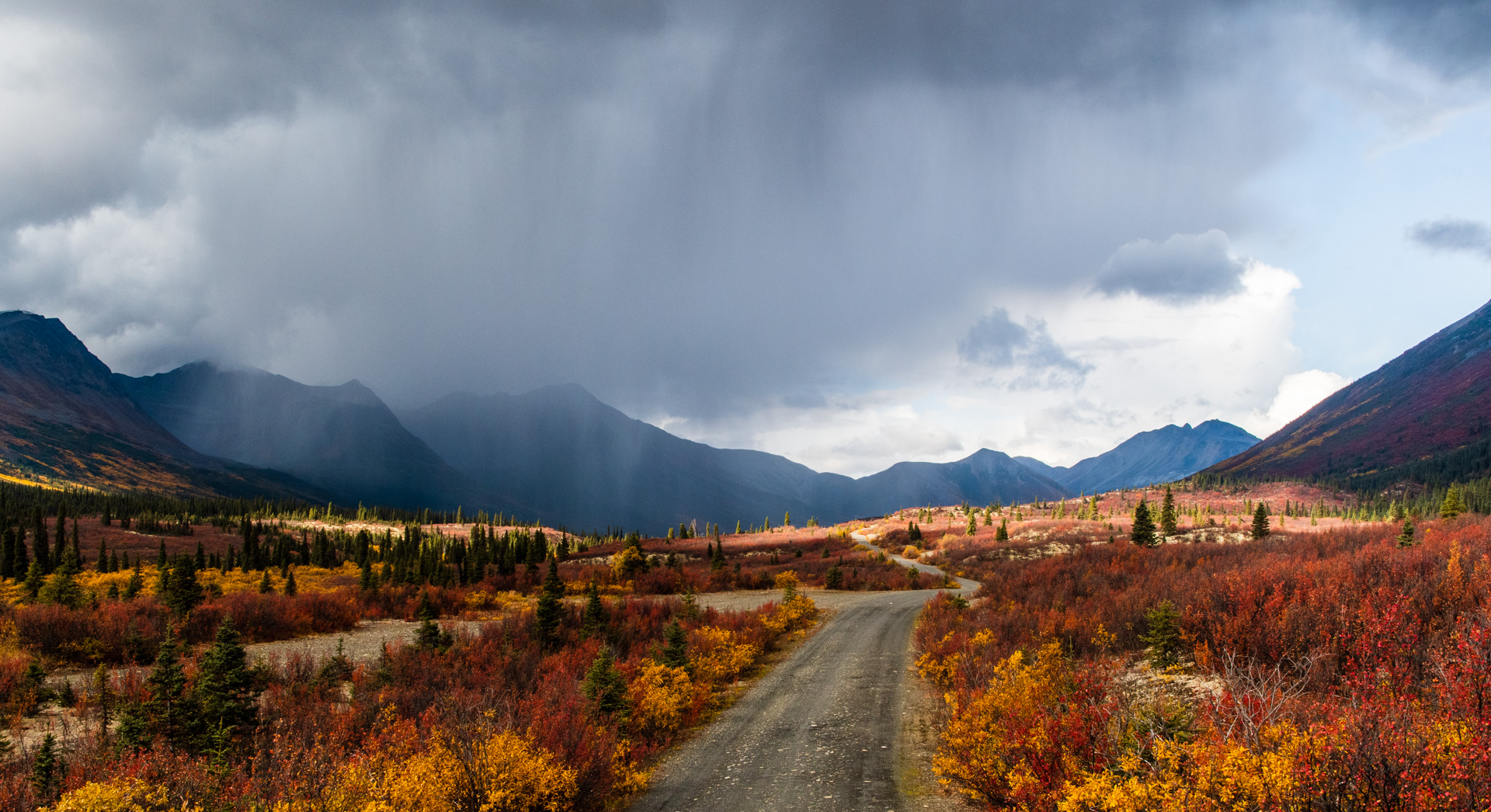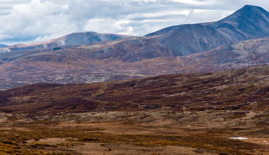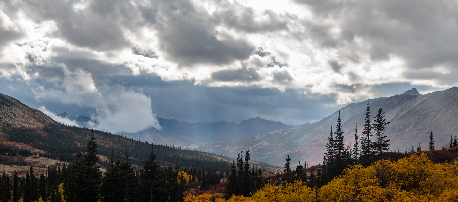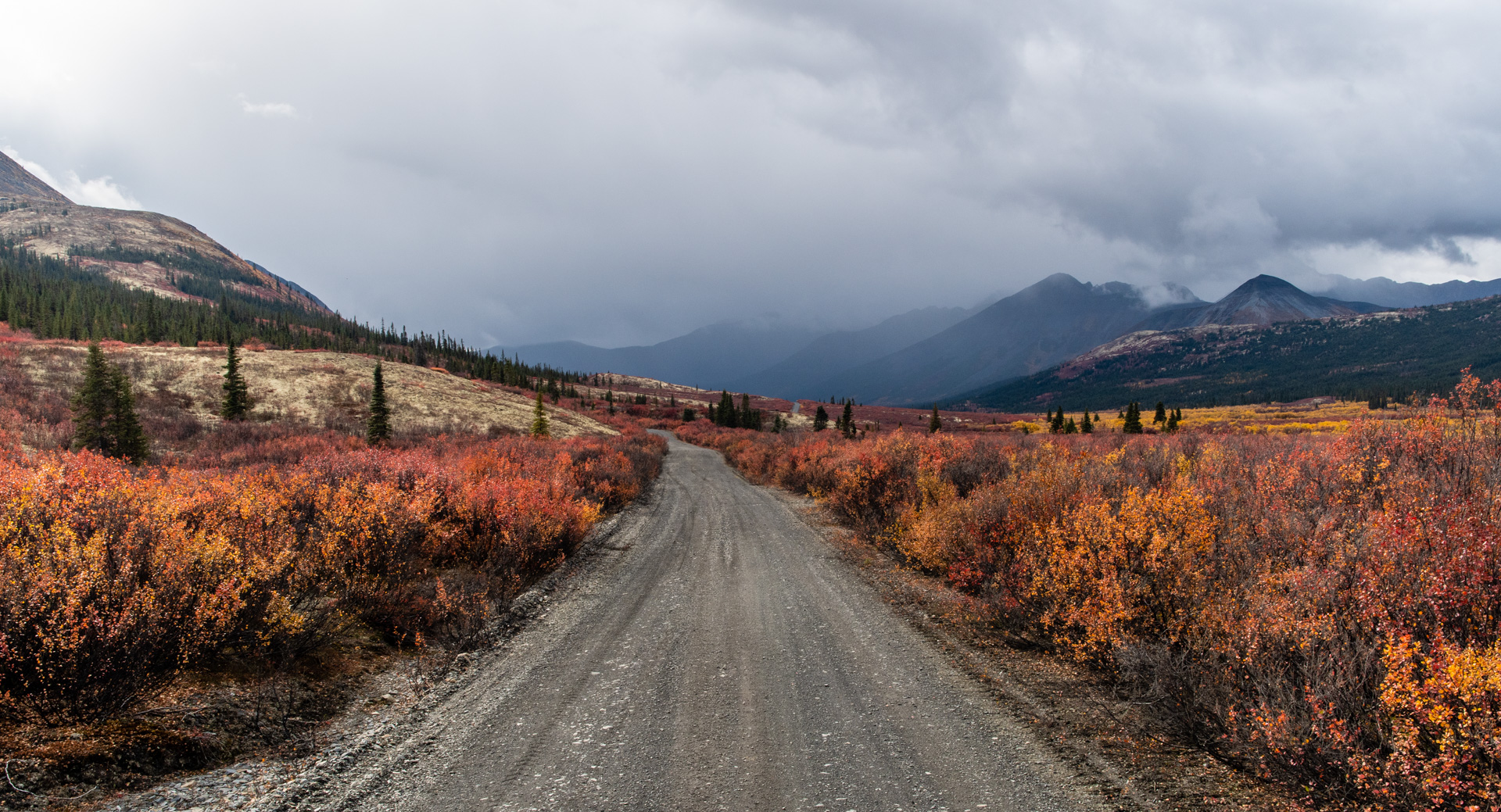 As the road reaches MacMillan Pass, it turns into the mountains and runs through the Macmillan river valley. Surrounded by close mountains. At this point I should mention that the weather was itself becoming epic. The sun was still shining through brightly, but there were isolated cells of torrential rains. I had to sit and wait by the side of the road for the rain to clear…several times. And it always did. But I could always see more clouds forming. There was some kind of weather system generating over the pass itself.