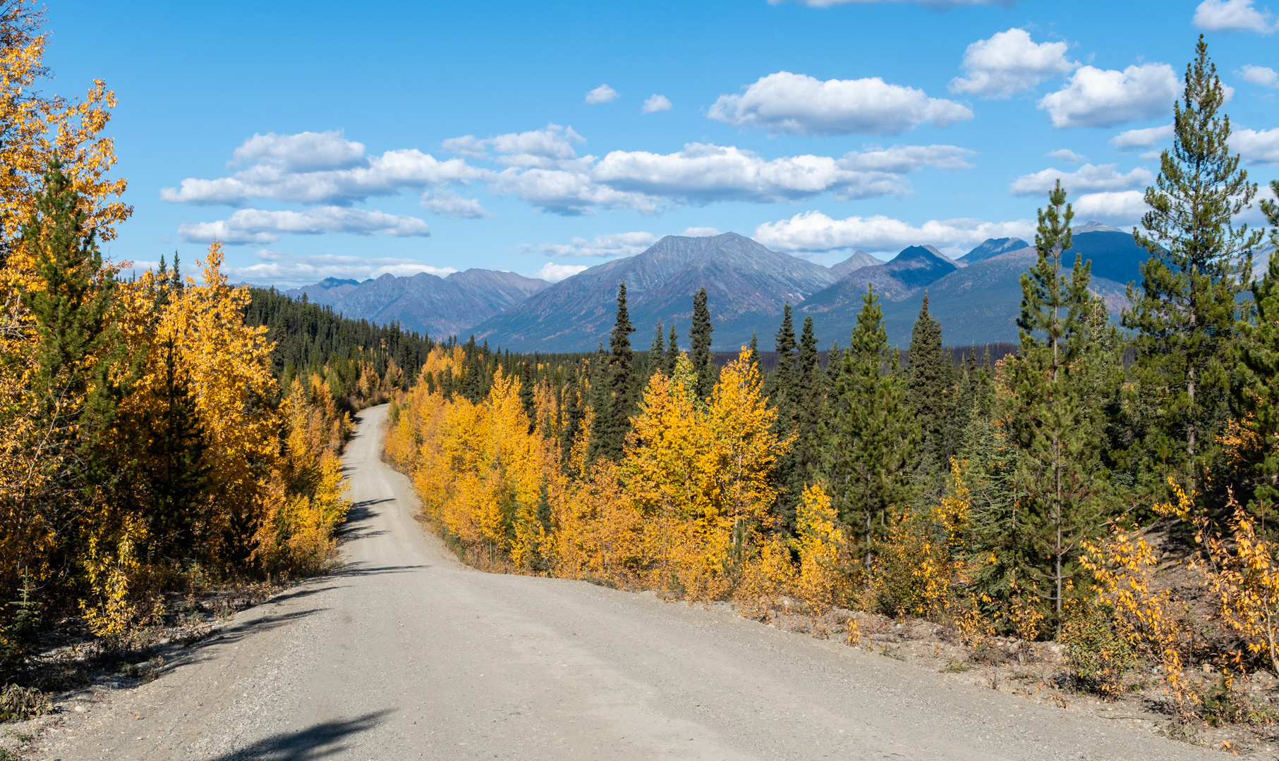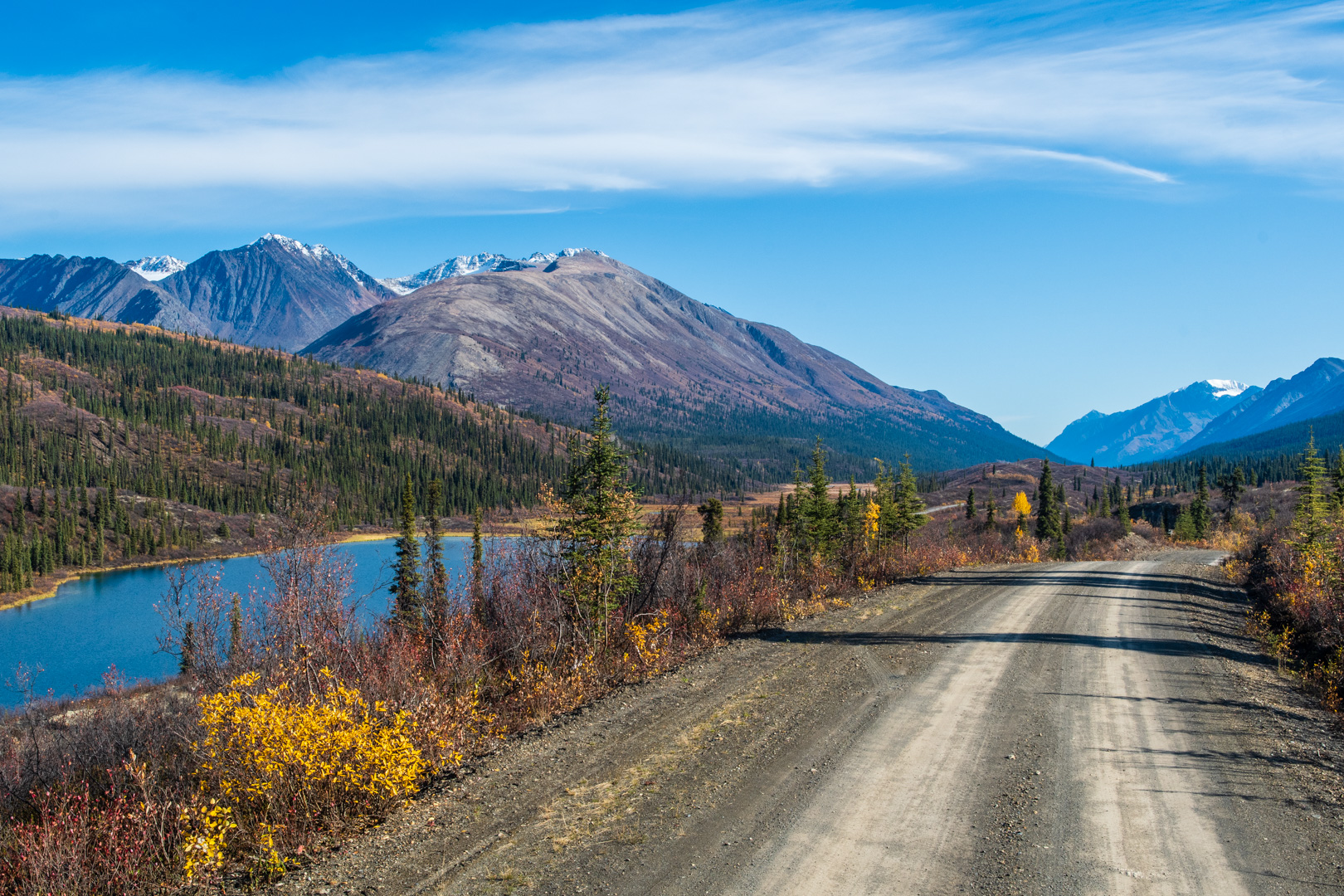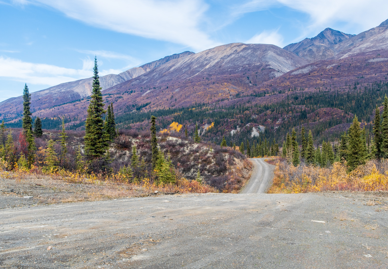 The beginning of the road is a nice drive, with the mountains slowly getting bigger. Unfortunately the colours were a bit muted compared with my previous days. I had missed peak colours here. In some ways I wish I had driven this road and then Canol…to keep my standard attempt at doing the best last. But I’m sure if I had done that I would have missed peak colours on Canol, so I’m glad it worked the way it did.