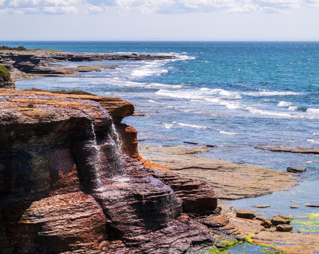 Further along there is a reddish stream that falls to the water below. I’m guessing there are metal deposits in the water, as everything around the falls is coated in a rusty red. It was an interesting contrast to the almost white rocks. Maybe where the name Cap Ferré came from?(iron cape)
