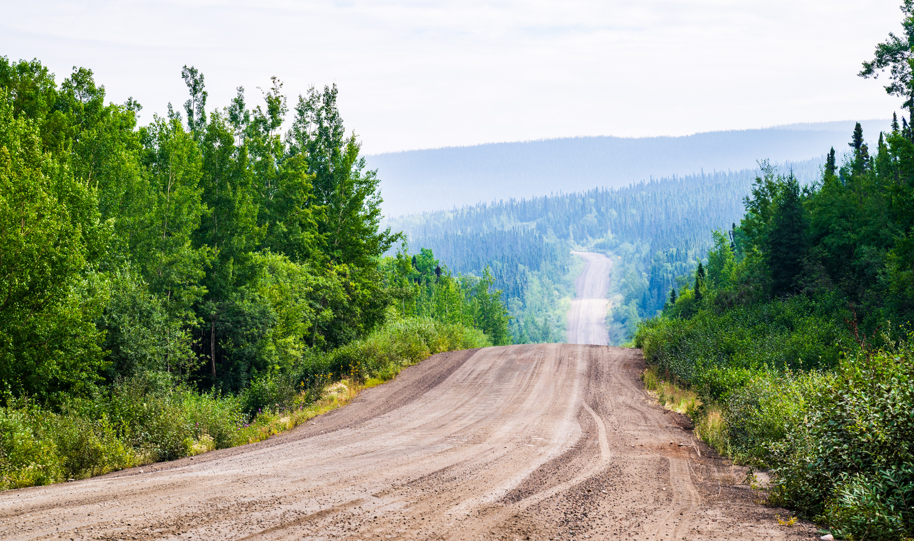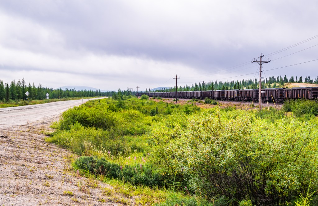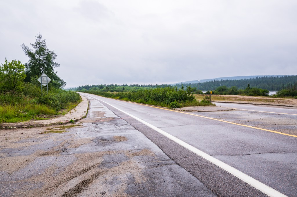 From the Fire Lake mine onward, the road is gravel again and very industrial feeling. It zig-zags over the railway, on which iron ore is transported to the coast. It was raining and muddy, and I managed to get stuck behind a tanker truck for a long stretch. I also had to wait at a railway crossing for a long ore train.