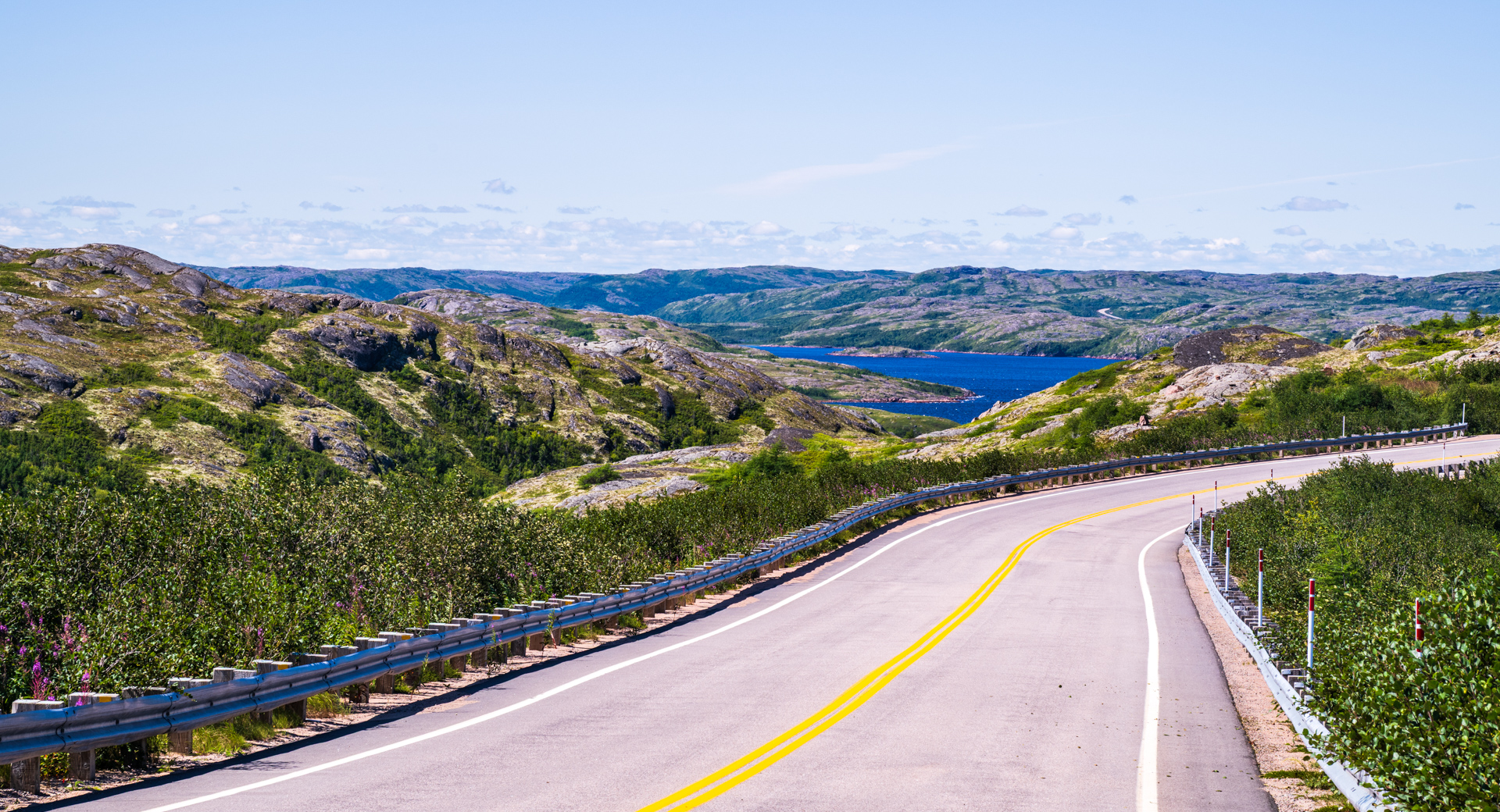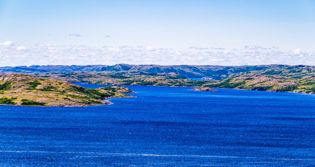 Then the highway rises over the rocks into the desolate tundra. Where the Labrador tundra is mostly green, on the Quebec side there are more rocks poking through, with more dramatic hills. The highway here is largely inland, but it is incredibly scenic.